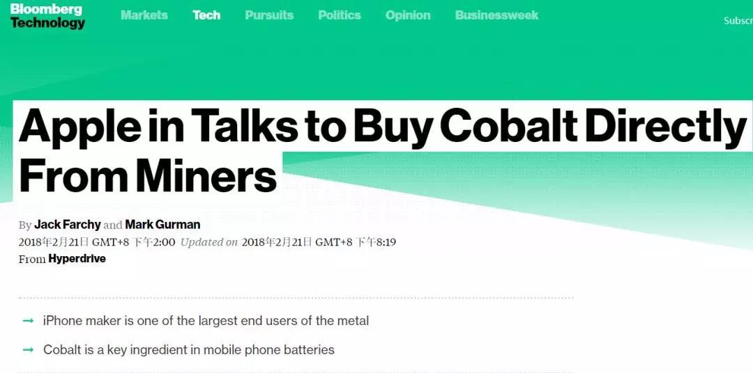 21日下午,彭博社发布了一条重磅消息:据相关人士披露,苹果正在谋求收购钴矿原料。
