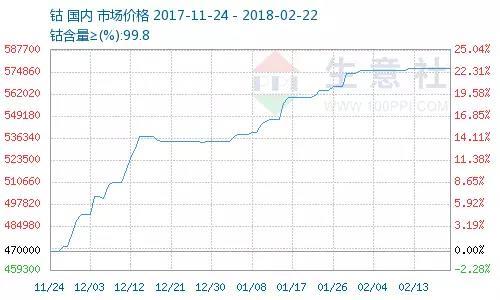 据生意社风向标数据,我国钴价自去年11月底以来已累计上涨22.3%,目前含量99.8%以上的钴矿价格在57.5万元/吨左右。