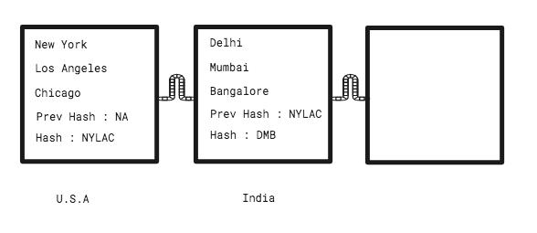 每个连续的区块将包含前面区块的散列,它们就这样串在了一起。如果有人在第一个区块里又加入了波士顿市,那原散列就变成了“NYLACB”。然而,印度的后续区块已经将散列存储为“NYLAC”。这种不匹配就会破坏链条。所以散列构造的目的是确保没有人篡改它。我想说的是你不能篡改我的记录。但如果你的确这么做了,我就会知道。