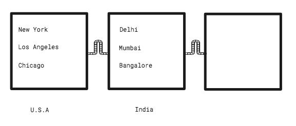 你的大部分所有权记录都存储在纸质账簿里,不过它们的安全情况很可疑。但区块链上的数据是没法篡改的。区块链可以分为区块和链。在某种程度上看来,它只是由一系列的串起来的区块构成的链条。既然它是存在于网络世界里的,那有些物理规则就可以不用考虑了。网络世界中数字信息被划分成块并链接在一起。例如,有这么几个区块,每个区块代表一个国家,各区块里有其代表国家的城市名。