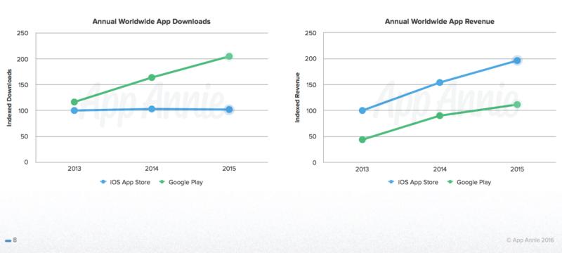 应用商店让iOS对Android形成了极大的压制。尽管下载量不一样,但苹果应用商店的创收要比Google Paly多出了75%。这是一个自我强化的循环,顶级开发者把主要精力都放在iOS上面(因为这个地方有钱),这对Android显然不利。