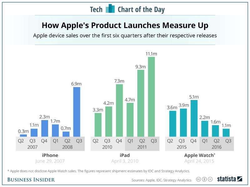 虽然iPad对苹果依然重要,但在2014年的时候显然已经走过了巅峰,那一年iPad占到了苹果收入的20%。2010年至今(2017年5月)iPad已经售出了3.6亿台,现在它的走势无疑市值走下坡路,市场份额正在萎缩。