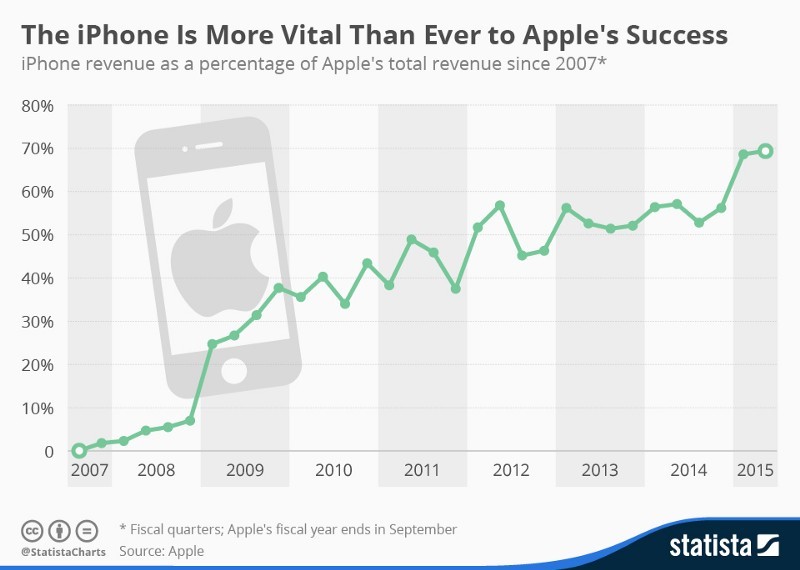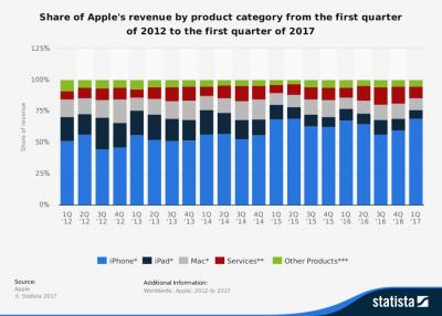 这种增长是惊人的,iPhone占据了苹果营业收入的很大一部分,达到了69.4%(2017年Q1)。尽管苹果热衷于指出iPhone是“加州设计”,但美国绝对不是市场的全部——2017年美国市场仅占iPhone总销售量的1/3。