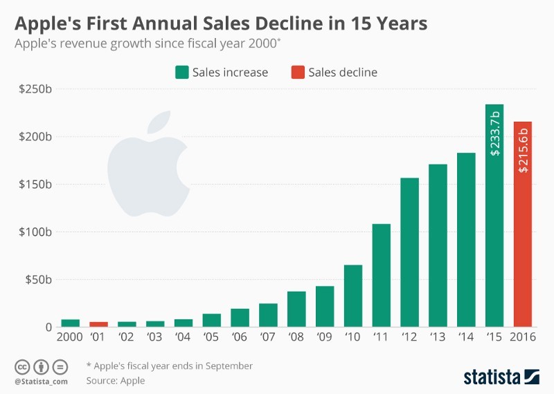 2016年的时候苹果就打了个盹,2016年Q3时iPhone的销量下挫了5.3%(相比上年)。5.3%的下跌加上几条产品线的虚弱表现足以令公司要承担一大笔债务来偿还投资者。
