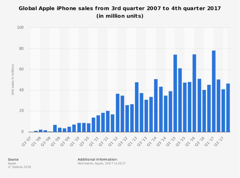 2007年夏天iPhone的横空出世改变了世界。自那以后,iPhone就统治了苹果的业务和营收——从2008年Q1的仅仅120万销售量增长到2017年Q4的7800万。
