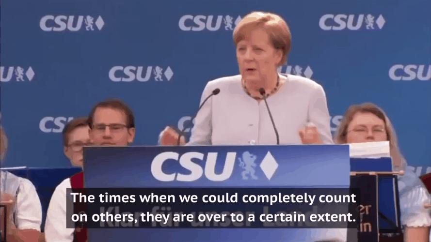 现在,在对抗deepfakes上,它们也有了用武之地。由业余爱好者创造的大多数的deepfakes都不是完全可信的。如果你仔细看,这些画面并不能完全吻合;在下面这段视频(为方便观看,转成了GIF)中,唐纳德·特朗普(Donald Trump)的脸并没有完全覆盖安吉拉·默克尔(Angela Merkel)的。你的大脑做了一些工作,填补了技术无法将一个人的脸变成另一个人的缺口。