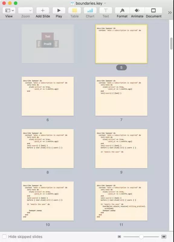 代码或图表最好要一点一点地堆叠起来。下面是 Boundaries 的幻灯片示例。代码一点一点地显示出来,这样我就可以一步一步地解释这些代码,不会出现用户读到第 9 行而我才讲到第 2 行的窘况。