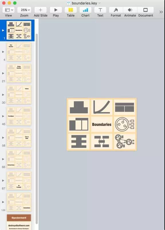 比如,Boundaries(文末有这个 PPT 的链接,也是程序相关的,你可以看看)这个演讲的幻灯片就被分为以下几个章节: