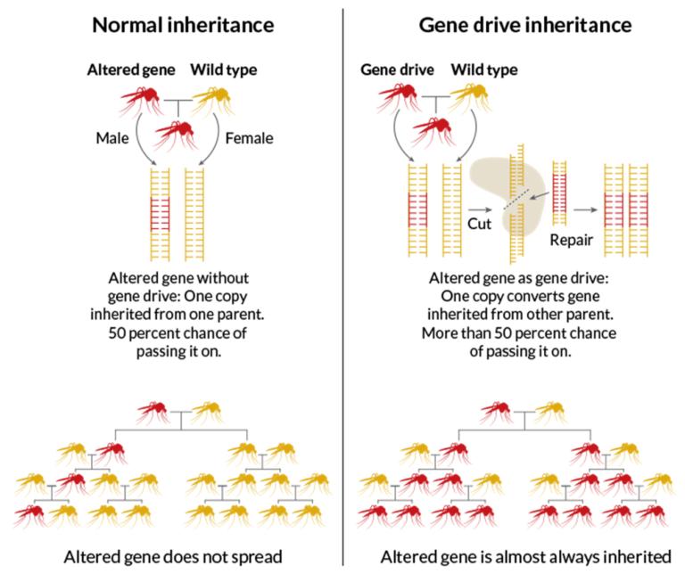 2016年12月,伦敦帝国理工学院的研究人员设想了一种消除整个携带疟疾寄生虫蚊子种群的方法。 若想实现这个想法,可以通过使用CRISPR系统编辑基因并添加DNA序列,从而引起蚊子胚胎中的偏倚遗传。 随着这些蚊子发育并长成成虫,它们会与其他野生蚊子交配,这样整个蚊子种群会停止携带疟疾。