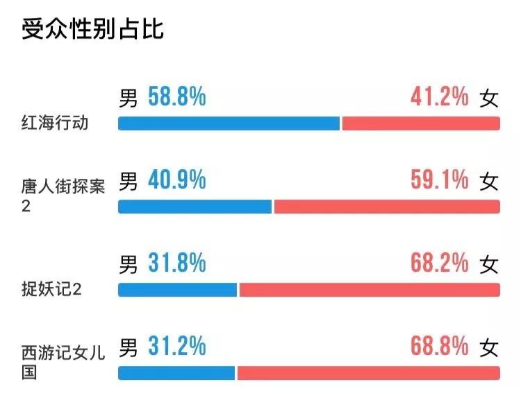 尽管《红海行动》在几部影片中最不合家欢,但是偏好军事、打斗题材的男性观众反而成为了贡献票房的主力军。通过淘票票专业版所提供的各片用户画像不难发现,《红海行动》的观众中,男性观众占比最高,为58.8%,比同期几部竞争影片影片高出10%-20%,中国男性观众的消费力一旦得到释放,所能带来的巨大影响,早在《战狼2》时就已经得到了充分的展现。
