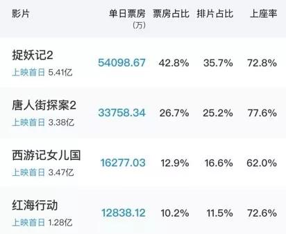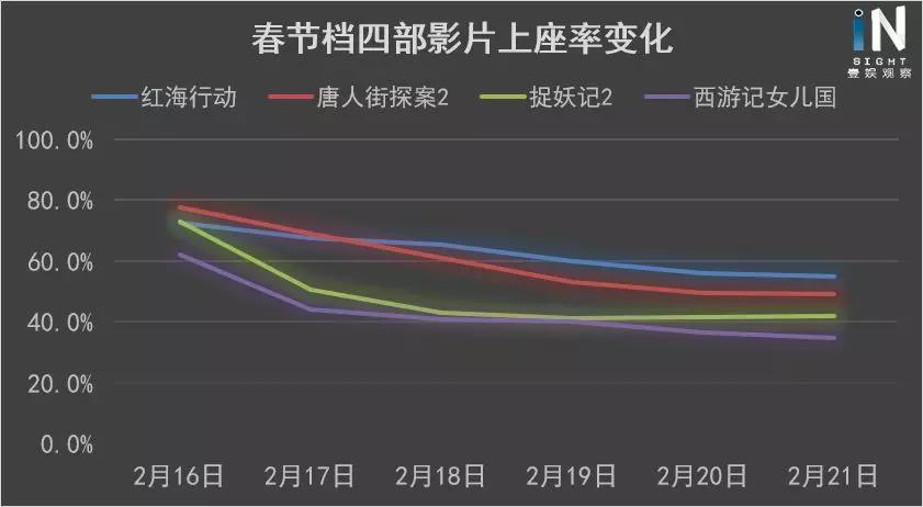 但叫人没想到的是,今年春节档的口碑效应在初二就发挥了显著的作用,在排片占比没有大幅变化的情况下,豆瓣评分5.2的《捉妖记2》和4.7的《西游记女儿国》因口碑不佳,上座率在第二天就有了20%左右的缩水,口碑上佳的《红海行动》和《唐人街探案2》(豆瓣7.2分)的上座率则依旧维持在七成左右。