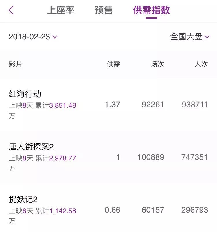 虽然两者还有7亿的票房差距,但是从目前的情况来看,最终的超越并非毫无可能。根据艺恩数据提供的数据显示,从票房份额/排片份额后得到的供需指数来看,春节假期结束后《红海行动》的供需指数仍旧高达1.37,处于供不应求的状态;反观《捉妖记2》和《唐人街探案2》,前者供需指数仅为0.66,明显供大于求,而后者1的供需指数则基本上处于一个平衡的饱和状态。亦有影城经理向壹娱观察表示,受持续走高的口碑和较高上座率影响,不排除进一步加大《红海行动》排片占比的可能。