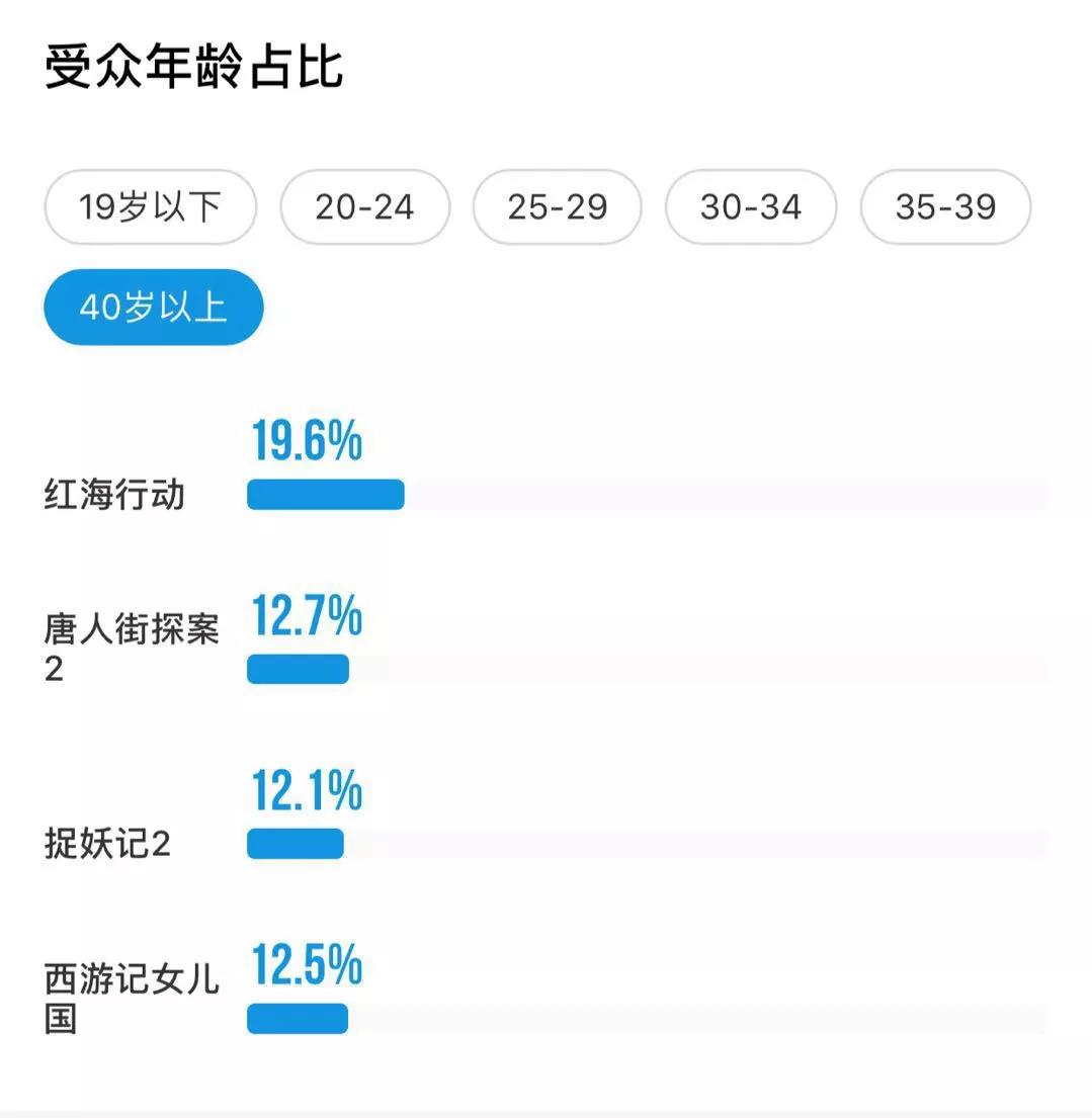 与此同时,数据也显示《红海行动》大龄观众远超其他影片,30岁以上观众占比高达45.9%,其中40岁以上观众接近20%——优质的影片内容和差异化的题材激发了非主流观影人群的观影热情,为其能在众合家欢影片中脱颖而出提供了基础。