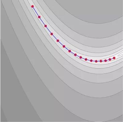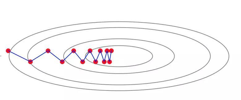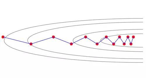这一问题的难点在于梯度并不指向最小值的方向,梯度下降法在使用过程中会形成“之”字形轨迹: