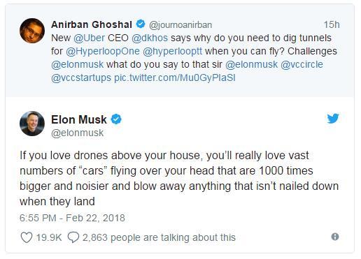 马斯克在自己的Twitter上表示:“如果你喜欢在自己家房子上面飞行,并且总有大量的汽车在上面飞来飞去当然没问题。这些汽车就像被放大1000倍的无人机,而且充满噪音,在着陆的时候巨大的气流甚至会将很多东西吹跑。”