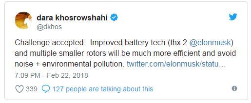 随后,Uber首席执行官达拉·科斯罗萨西(Dara Khosrowshahi)对马斯克进行了回应,表示飞行汽车通过使用诸如特斯拉公司先进的电池生产技术以及更小的旋翼,可以让自己逐渐变得更加环保、噪音更小。