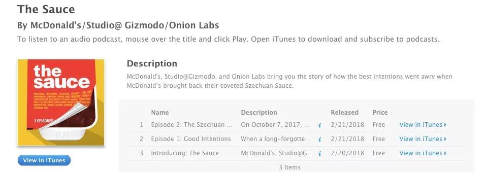 在时隔 4 个月之后,“四川辣酱”的发售终于有了眉目,不仅供给量远超去年 10 月的份额,并且麦当劳还专程推出了一个叫“We Want The Sauce”的网站,甚至开通播客“The Sauce”带来三段关于这款辣酱的小故事,把这场怀旧营销搞得有模有样。
