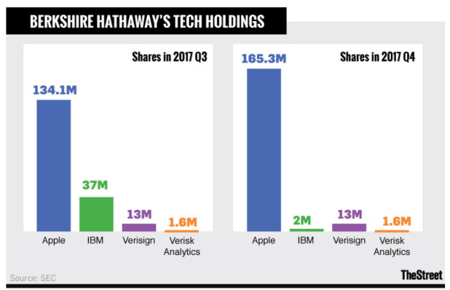 在2月24日公布巴菲特致伯克希尔-哈撒韦公司股东的信函前,该公司在其第四季度Form 13-F 文件中披露,在上个季度,它已将其所持IBM的股份削减了3500万股,减少至200万股。它所持苹果的股份则从1.341亿股增加到了1.653亿股(约合290亿美元)。这相当于占苹果3.25%的股份。