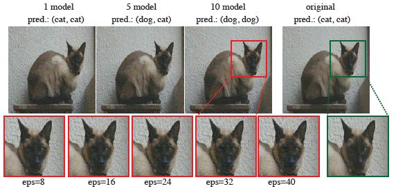 图中,使用了不同模型来生成对抗图像。从左往右,随着训练模型的数目不断增加,图像中的猫看上去更像狗。eps代表图像中添加的对抗扰动值,即便当eps=8的时候,图像中的猫看起来也更像一只狗。