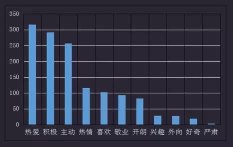 热爱、积极、主动、热情、喜欢分列第一至五位,体现用人单位招聘需求中突出从业者对工作的感情态度以及工作的主动性能力要求。真实的媒体工作面临长期熬夜、生活不规律、防火防盗防记者的等危险状况,要求从业者对行业有极强的热爱和兴趣,否则将难以胜任高强度的媒体工作。