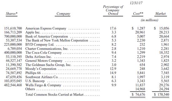 从我们的股票投资组合—我们持有的股票可谓是多元化上市企业集团中的“少数股权”—来看,伯克希尔2017年获得了37亿美元分红。