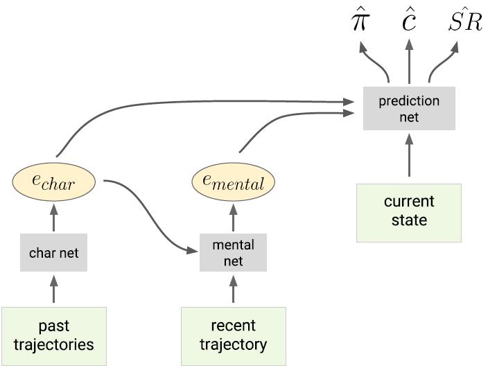 character net 从 POMDP 集合中解析智能体过去的轨迹,从而形成 character 嵌入 e_char。心理状态网络解析当前片段的智能体轨迹,形成心理状态嵌入 e_mental。然后,这些嵌入被输入至预测网络,可用于查询当前状态。预测网络输出对智能体未来行为的预测,如下一步动作概率 π hat、特定对象被消耗的概率 c hat 和预测后继者表示 SR hat(Dayan, 1993)。