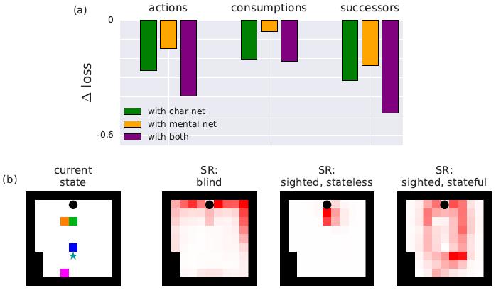 (a)ToMnet 的三个组件分别对应三个行为预测目标,图中表示简单 ToMnet 与没有 character net 或没有 mental net 的网络的对比。长条越长越好;具备 character net 和 mental net 的网络最好。(b)查询 POMDP 状态在时间 t = 0 时,ToMnet 对智能体未来状态占用的预测(左),如图 4d 所示。星星表示子目标。右边的三幅图根据每个亚种的示例智能体在 N_past = 5 past POMDPs 上的行为输出(示例智能体通常指粉色对象)。ToMnet 事先并不了解每个智能体属于哪个亚种,但是可以根据智能体之前的行为推断出来。
