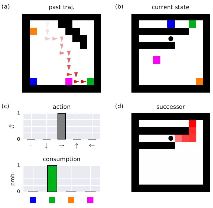 (a)示例智能体之前的轨迹。彩色方块代表四个对象。红色箭头表示智能体的位置和动作。(b)查询示例:来自新 MDP 的状态。黑点代表智能体位置。(c)基于(a)中对之前轨迹的观测,针对(b)中的查询 MDP,ToMnet 对智能体下一个动作的预测(上方)和对该片段结束时对象是否被消耗的预测(下方)。(d)ToMnet 使用折扣因子 γ = 0.9,对(b)中查询的后继者表示(successor representation,SR)的预测。黑色部分表示更高的期望折扣状态占用。