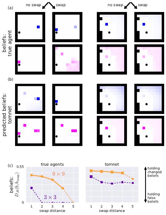 章节 3.5 中,我们展示了能够训练 ToMnet 来预测智能体的信念状态,明确揭开智能体的错误信念。我们也展示了 ToMnet 能单独从行为中推断什么智能体具有观看的能力,以及因此它们倾向于相信什么。