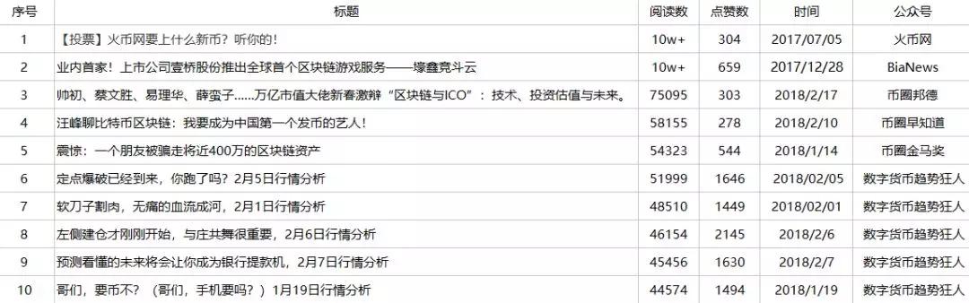 数字货币交易机构,比如“火币网”、“OKEX”等。这些账号发布的内容与自身业务紧密相关,比如“火币网”的一篇10w+文章题目为《【投票】火币网要上什么新币?听你的!》。