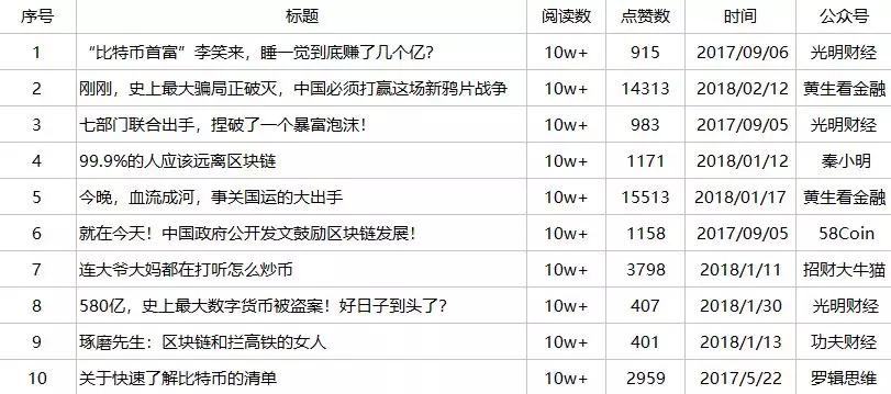 财富类前十的文章中,有三篇来自公众号“光明财经”。分别介绍李笑来的比特币资产、官方明确禁止ICO、以及史上最大数字货币被盗案。公众号“黄生看金融”也有两篇文章入围,都是趁着区块链暴跌时发出,立场鲜明地表示“区块链是个骗局”。