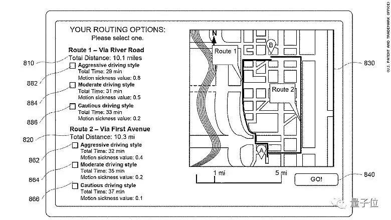 △ Waymo提交的专利资料给乘客选路径的交互界面上面有晕车指数和路径预计时间