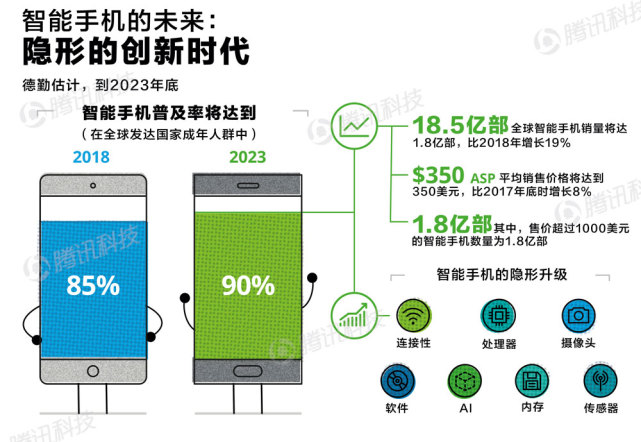 德勤预计,到2023年底,在全球发达国家成年人群中,智能手机普及率将达到90%,而2018年这一数字为85%。