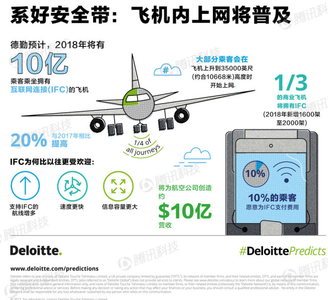 德勤预计,2018年将有10亿乘客乘坐拥有互联网连接(IFC)的飞机,与2017年相比提高20%。10%的乘客愿意为IFC支付费用,这些人群将为航空公司创造约10亿美元营收。