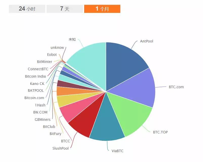 分叉,来自于神仙打架。比特币有两个核心群体,除了维护程序的Core,还有矿工。因为比特币网络是分布式网络,理论上矿工是分在在全球各地的个人。但是,随着挖矿的难度的增加,不是每个人都能稳定的挖到,挖矿的结果跟买彩票一样,所以很多矿工抱团,约定一起挖,有福共享,挖出来的大家均分。这就形成了矿池。矿池越来越大,大的矿池,头部的几家联合起来,占了超过50%的算力。下面这张图( http://www.qukuai.com/pools) 统计了2月25日前一个月的算力分布。
