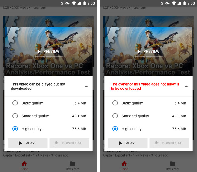 Youtube Go 最大的亮点便是可以下载视频,有三档清晰度可选,其中「高清」(High Quality)大概相当于 480p,剩余两档分别为 320p 和 GIF 动图画质。奇怪的是每个打开的视频都提醒我「能放,但作者不让下」,我从始至终没找到可以下载的视频,只好作罢。