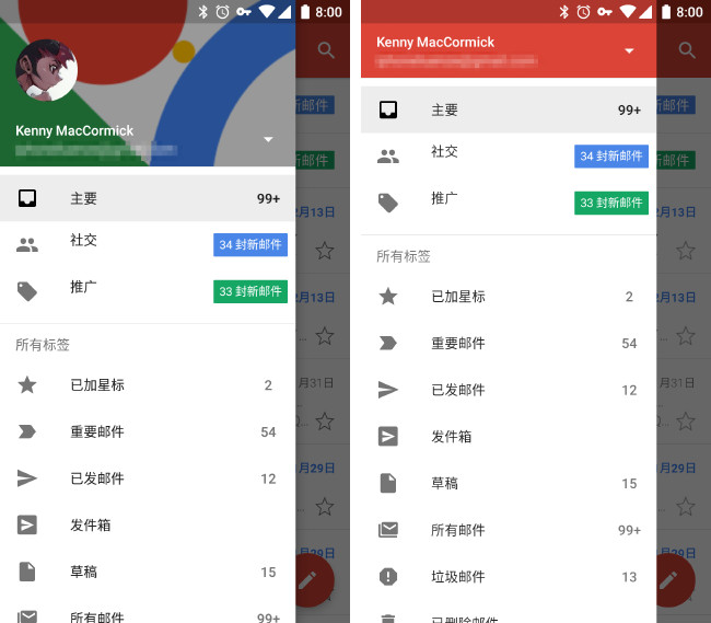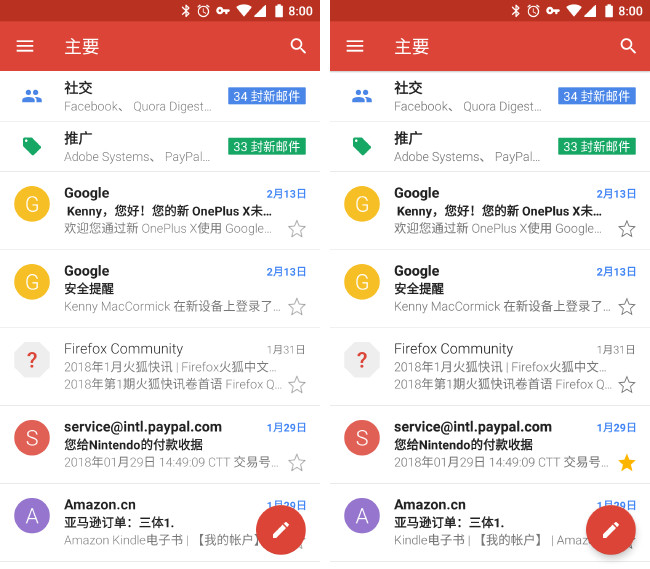 上面两张图,你能分辨得出哪边是 Gmail Go 吗?其实还是很好认的,因为 Gmail Go 去掉了顶栏与浮动按钮的阴影。除此之外,两者几乎一模一样,包括多选以及滑动归档/删除等操作,Gmail Go 也都有提供。