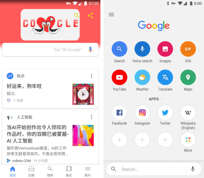 虽然 Google Go 听上去只是一个「精简版」,但它与 Google 搜索应用的设计理念不尽相同。这点从二者的主页间就看得出 —— Google 的首页上是为你定制的「资讯流」,而 Google Go 的首页则充斥着各种功能选项。