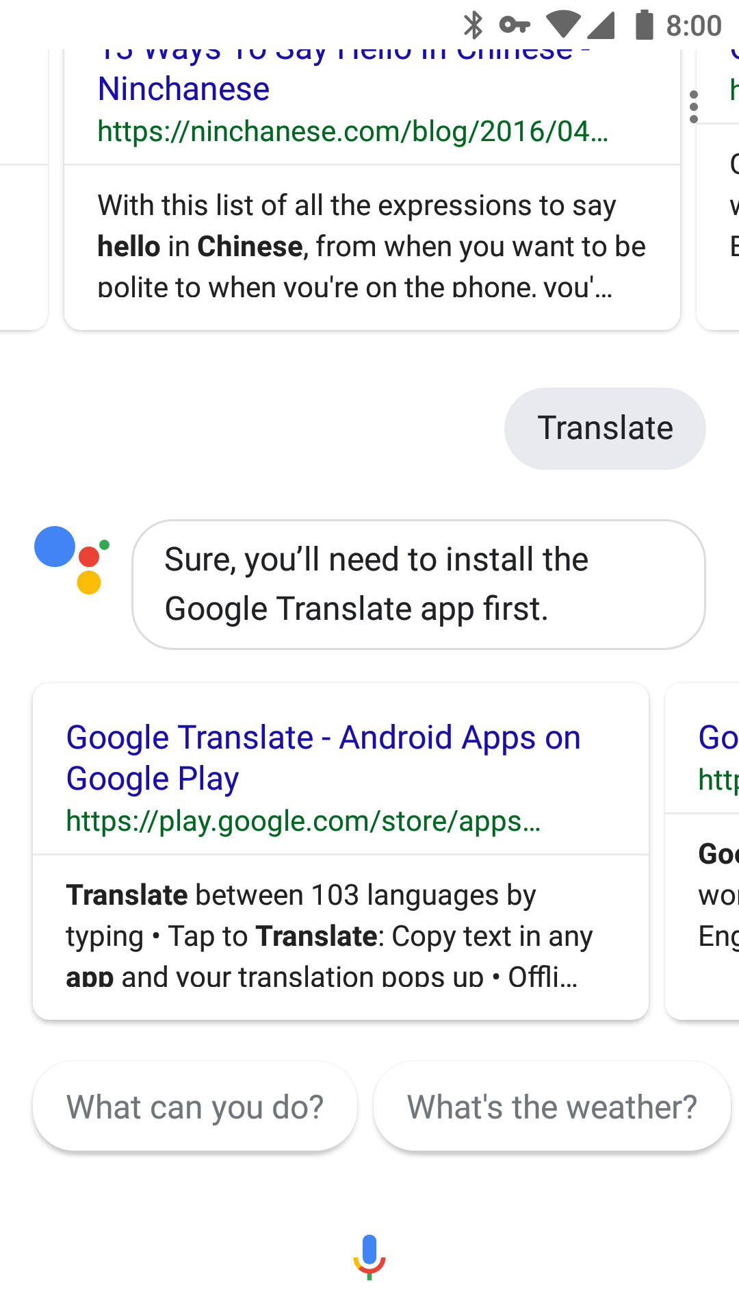 更诡异的是,它似乎支持翻译,但直接让它翻译它还是会去搜索网页(...),如果直接对它说「翻译」,它又会提示你去安装 Google 翻译应用。