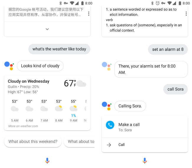 不过,它至少还是能听懂一部分指令的,例如显示电子邮件,查看天气,来点音乐等。而一些控制手机功能等指令它也能完成,设置个闹钟或是打个电话也不在话下。