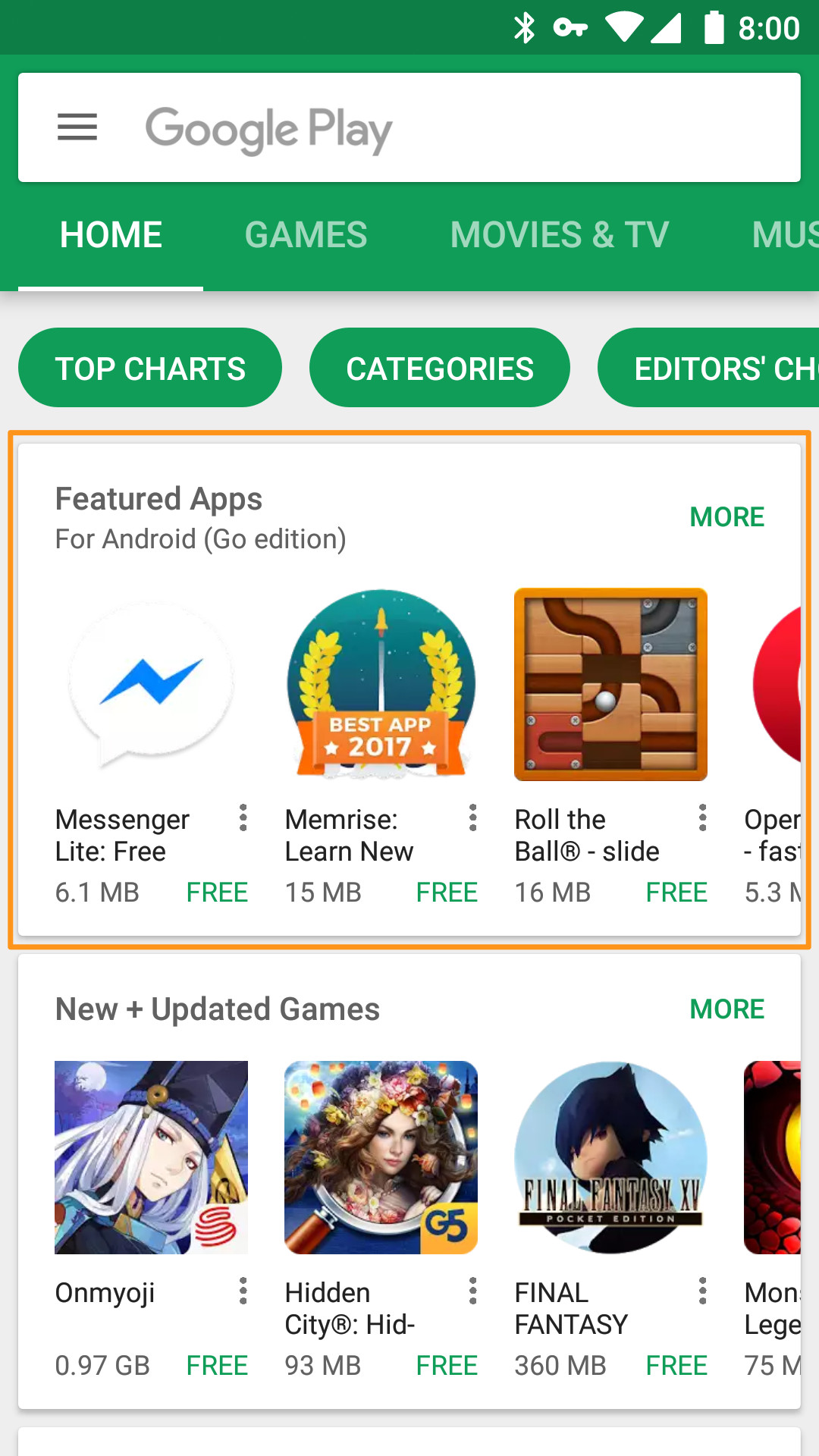而针对 Android Go 优化的应用,则会出现在 Google Play 首页的专门区域。