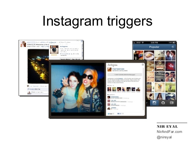 一旦你下载安装了Instagram,自主型外部触发就将发挥作用。用户手机屏幕上的应用图标,以及朋友圈里的图片更新,都将召唤你重新打开这款应用。随着你使用次数的增多,Instagram会与你的内部触发建立起紧密的联系,也就是说,大部分用户对应用的使用将从偶尔为之演变为必不可少。