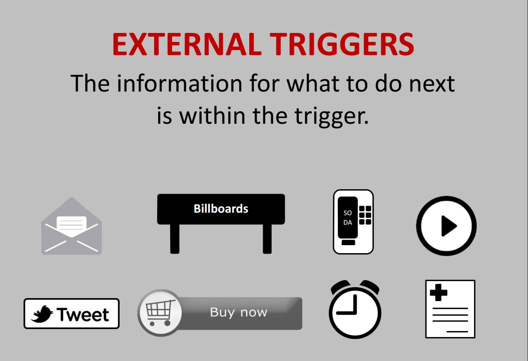 外部触发通过将信息渗透在用户生活的各个方面来引导他们采取下一步行动。通过发出行动召唤来暗示用户,这是打造习惯养成类产品的第一步。我们身边的任何东西都有可能充当行动召唤。外部触发通常都潜藏在信息中,这些信息会告诉用户接下来该做些什么。 外部触发会把下一个行动步骤清楚地传达给用户。