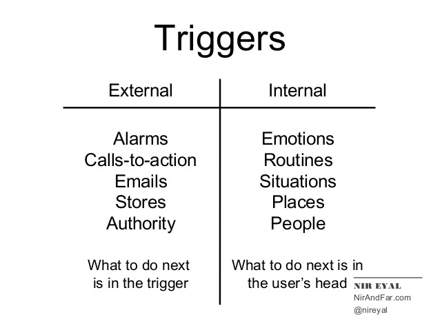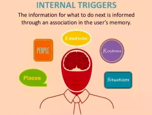 内部触发通过用户记忆存储中的各种关联来提醒他们采取下一步行动。当某个产品与你的思想、情感或是原本已有的常规活动发生密切关联时,那一定是内部触发在起作用。外部触发会借助闹钟或是大号的按钮这一类感官刺激来影响用户,内部触发则不同。内部触发你看不见,摸不着,也听不到,但它会自动出现在你的脑海中。所以说,将内部触发嵌入产品是消费型产品成功的关键。