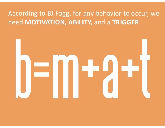 很多理论已经就人类行为受何种力量驱动这一问题进行了阐释,斯坦福大学说服技术研究实验室的主任福格博士构建了模型。借助这套模型我们可以相对容易地了解人类行为背后的驱动因素。福格认为,要使人们行动起来,三个要素必不可少。第一,充分的动机;第二,完成这一行为的能力;第三,促使人们付诸行动的触发。