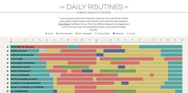 “明星创意工作者的日常生活”是一个完美的可视化数据的例子,它具备了一个可以有效传递信息且吸引人的图表所应具有的所有因素:将大量数据组合成一个图表,使用不同颜色区分数据趋势,使读者对数据获得全局观感,实现读者和数据互动以吸引读者,数据展示一目了然,理解起来非常简单。