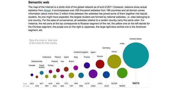 传达复杂思想的有效方法是使用符号和隐喻。例如,Ruslan Enikeev创建的这个雄心勃勃的互联网可视化数据。通过使用太阳系行星的隐喻,Enikeev能够创建一个“互联网地图”,帮助用户直观地看到每个网站的相对影响范围和影响力。例如,网站流量由地图上圆圈的大小表示。