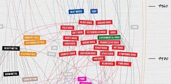 有效可视化数据的另一个标志是它能够汇总大量信息,并在此过程中节省时间和精力。例如,这种可视化数据在单个图表中展示了摇滚乐100年的发展历史。它不仅为你简化了信息——将一个世纪的信息浓缩为一个不到一分钟的片段,还提供了从电子蓝调到黑色金属等各种类型的音频范例。