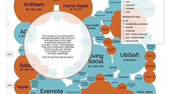 这种可视化数据不仅具有前面提到的所有特性,还允许用户直接便捷的访问所有原始数据。此外,通过使用按照数据源的大小绘制形成的气泡,读者可以获得数据源的可靠概览。如果读者想要深入或浅显的了解信息的细节,他们也可以通过使用不同的过滤器和原始数据来达到目的。