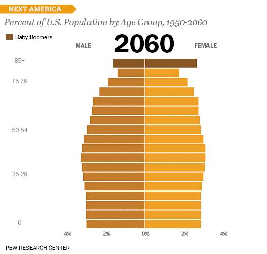 Pew研究中心制作的美国年龄金字塔是一个值得注意的例子,展示了如何通过动画来有效地传达随着时间的推移产生的变化和趋势。这种类型的可视化数据不仅可以将大量信息打包到单个图形——23个条形图组合成单个GIF图片——还可以在社交媒体上轻松共享并嵌入到任何位置。